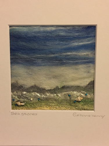 A collection of sea Inspired Mixed Media Textile Art. Each piece is made using Irish linen or cotton fabric as the base. This is then layered with merino wool, spun silk & bamboo felt fibres that are not felted down but gently blended together using other Techniques of subtle stitching, fabric manipulation and sources of heat are used to achieve my desired painterly effect. Other materials are used to create the shore from fabric, handmade papers and other media that create textured surfaces.
